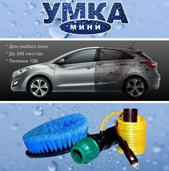 УМКА мини - это альтернатива ручной мойки автомобиля. Минимальный расход воды, максимальное удобство! Принцип действия прост: опускаем мотор-насос в емкость с водой, штекер подключаем к гнезду прикуривателя, и вода из емкости при помощи насоса подводится к щетке через гибкий шланг.