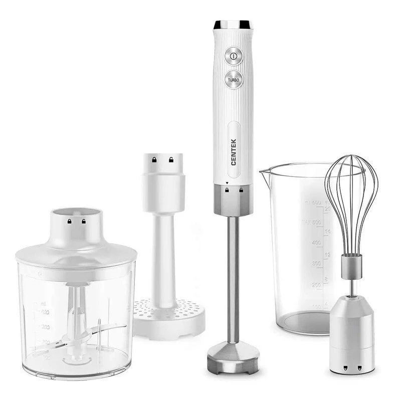 Блендерный набор 4 в 1 Centek CT-1352 – это миксер, ручной блендер, чоппер и насадка для пюре в одном приборе. Мощность 1000 Вт и специальная заточка лезвий способствуют быстрому и качественному приготовлению. Высокое качество материалов: насадки и ножи сделаны из высококачественной нержавеющей стали.