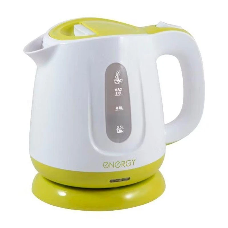 Электрочайник ENERGY E-234 в пластиковом корпусе зеленого цвета поддерживает систему автоматического отключения, которая срабатывает при отсутствии воды в резервуаре объемом 1 л. Подключение к сети осуществляется через 0.71-метровый кабель, хранить который можно в специально отведенном отсеке.