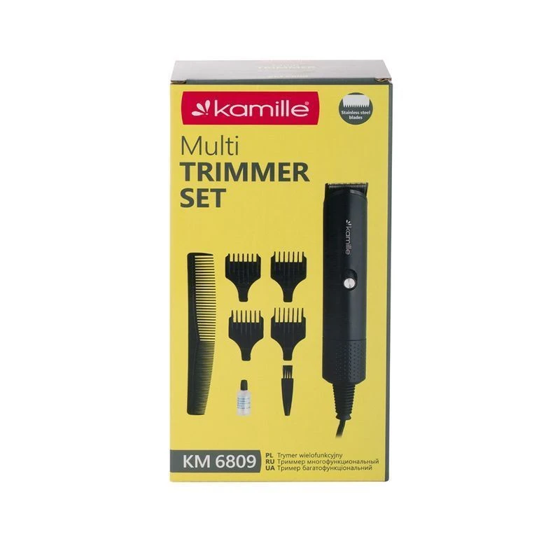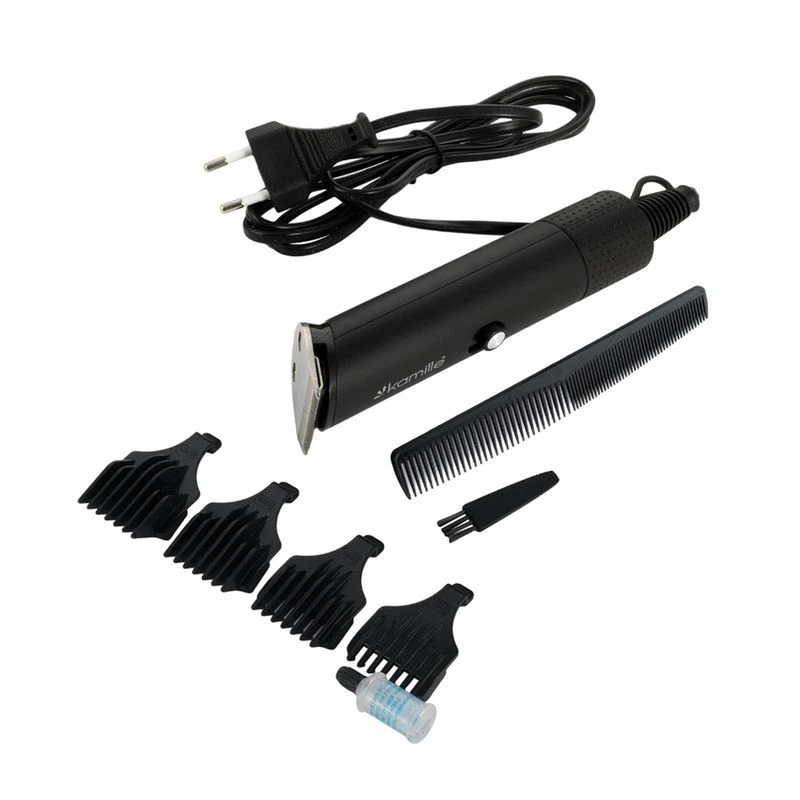 В состав входят: машинка электрическая, четыре насадки для волос (3мм-6мм-9мм-12мм), 1 масло, 1 щетка, 1 длинная расческа