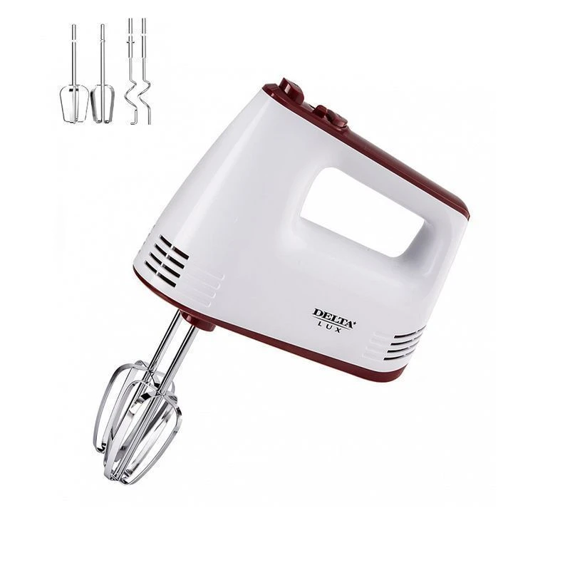 —Миксер нерж.сталь DELTA LUX DE-7700 бело-бордовый 400Вт, 5 скоростей, 4 насадки, режим Турбо (6)