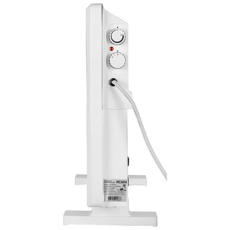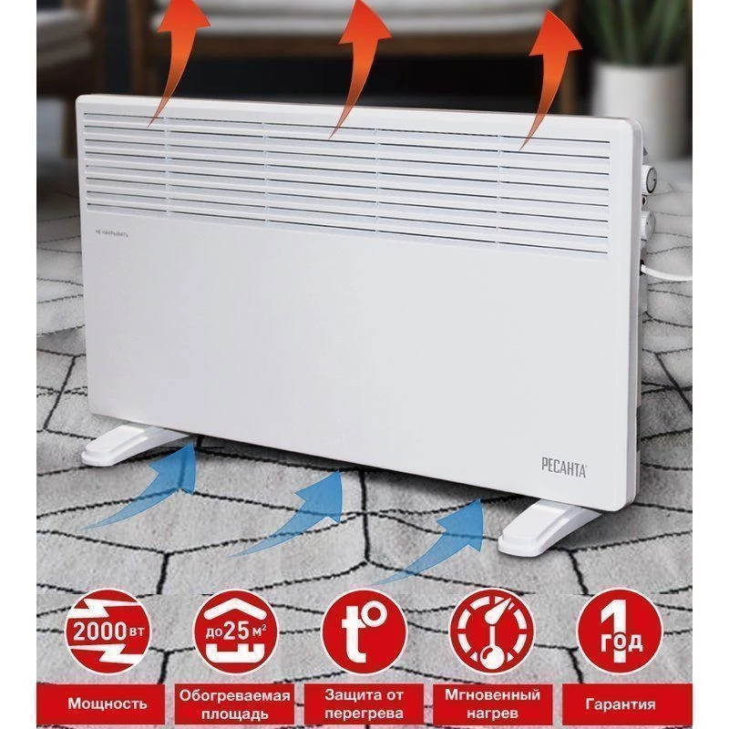 Модель работает на базе нагревательного элемента типа стич, который быстро достигает нужной температуры, не создает шума, позволяет экономить электроэнергию. Теплый воздух проходит через жалюзи в верхней части корпуса и перемешивается с холодными массами за счет естественной конвекции. Электроконвектор оснащен термозащитой, которая исключает риск поломки устройства из-за перегрева. На боковой стороне корпуса расположено управление. С помощью нижнего регулятора можно выбрать оптимальный режим мощности: 750, 1250 или 2000 Вт. Верхний регулятор с плавным вращением позволяет выставить нужную температуру нагрева воздуха. Мощности устройства достаточно для обогрева комнаты площадью 20-25 м?. Конвектор имеет тонкий металлический корпус с защитным покрытием белого цвета. Вес оборудования составляет 5,67 кг. В комплекте прилагаются опоры для размещения электроконвектора на полу и крепежный набор для настенной фиксации.