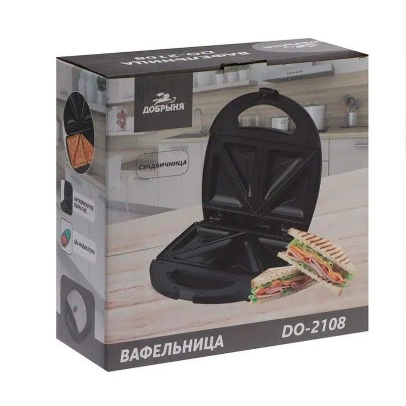 При помощи сэндвичницы Добрыня DO-2108 вы всегда сможете порадовать себя и близких хрустящими бутербродами. Это отличный компактный прибор для быстрого приготовления ароматных горячих сэндвичей. Для наилучшего пропекания в конструкции реализован равномерный прогрев рабочей поверхности с антипригарным покрытием. Ненагревающиеся ручки позволяют использовать сэндвичницу без риска обжечься, а система защиты от перегрева исключает повреждение прибора. Сэндвичница снабжена индикаторами работы и нагрева, а также специальными ножками для устойчивости. Прибор занимает минимум места, даже если не используется, поскольку для него предусмотрена возможность вертикального хранения. С помощью сэндвичницы можно без особого труда получить вкуснейшие домашние горячие сэндвичи всего за несколько минут.