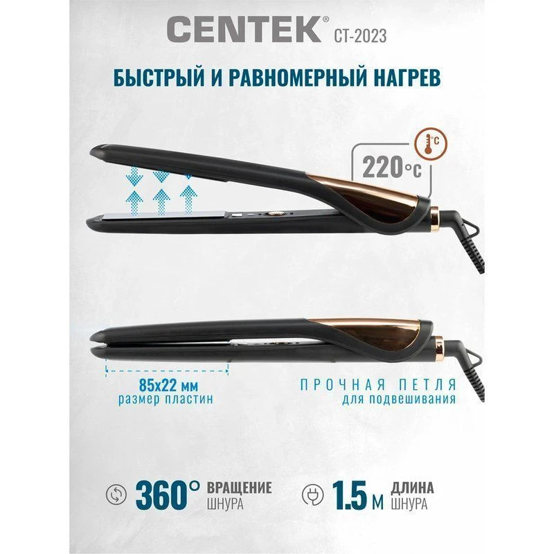 Керамические пластины размером 85*22мм снижают негативное воздействие высоких температурных показателей, предотвращая повреждение волос.