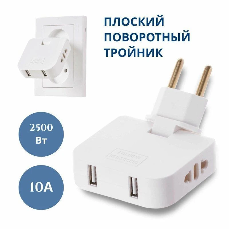 У вас есть неиспользуемая электрическая розетка, перекрытая мебелью, к которой трудно подобраться? Плоский поворотный электрический тройник с usb в розетку решит данную проблему. Тройник разветвитель электрический с 2 розетками и 2 USB разъемами подходит для узких, труднодоступных мест (за диваном, кроватью, тумбой, телевизором на кронштейне и т.п.). Плоский поворотный тройник для розетки с USB гнездами имеет небольшой размер и вращающийся на 180 ? штекер, с помощью которого можно регулировать угол наклона электрического тройника 16А. Так, разветвитель сетевой тройник позволит подключить электроприбор даже при наличии небольшого пространства, исключив при этом заламывания проводов в узких местах.