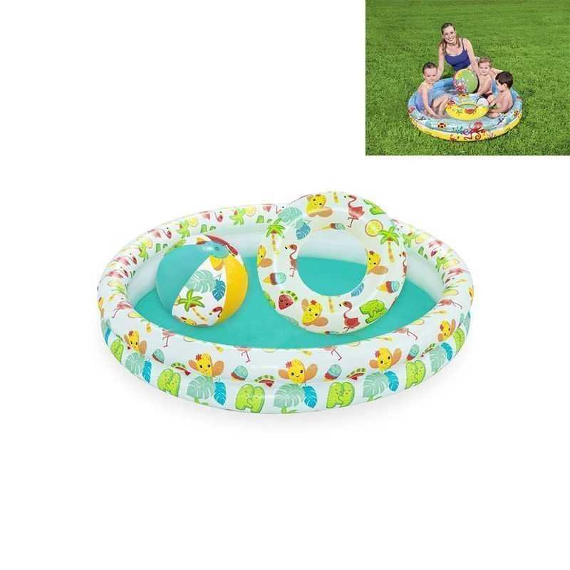 В комплекте с бассейном надувные мяч и круг в цвет бассейна.