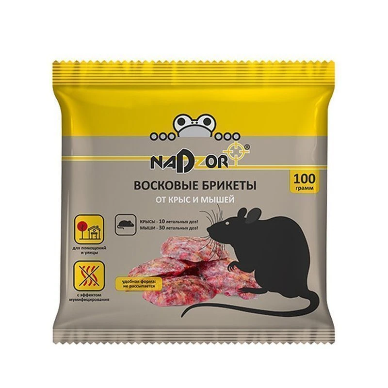 Универсальная приманка для уничтожения мышей и крыс. Основу составляет измельченное зерно, введенное вместе с Активным действующим веществом в расплавленный парафин и сформированных в форме небольших брикетов оригинальной формы, удобных для поедания, как крысами, так и мышами.