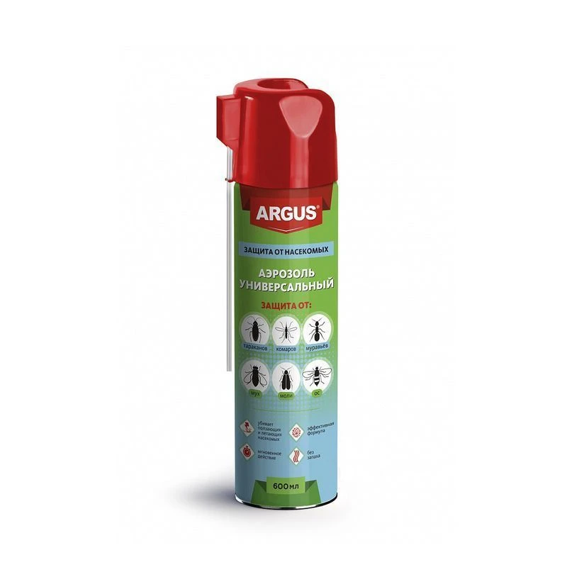 Ползающие насекомые: держа баллон вертикально, нажать на распылитель и с расстояния 20 см направить струю «ARGUS» в возможные места обитания, скопления и передвижения насекомых. Для уничтожения тараканов, постельных клопов, муравьёв обработайте щели вдоль плинтусов и прилегающие к ним участки стен и пола, вдоль труб водопроводной и канализационной систем, щели за дверными коробками, обратную сторону картин, ковров, мебели, а также места передвижения насекомых для мух обработать места их посадки. После обработки помещение проветрить в течение 30 минут.