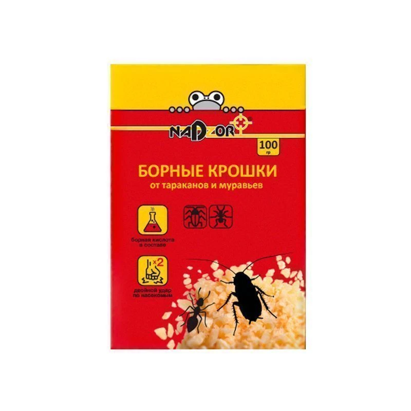 Борная кислота - это самое известное народное средство, которое оказывает инсектицидное действие в отношении тараканов и муравьев. Следуя на запах, тараканы начинают поедать приманку, содержащую борную кислоту и пищевой аттрактант с ядом фипронил. Происходит двойной удар по насекомым: действующие вещества нарушают функционирование периферической нервной и репродуктивной систем, приводя к летальному исходу. Фипронил начинает своё воздействие, даже если таракан просто проползет по борным крошкам, и работает по «эффекту домино»: поскольку мертвых тараканов съедают живые, продолжается дальнейшая переноска яда от особи к особи.