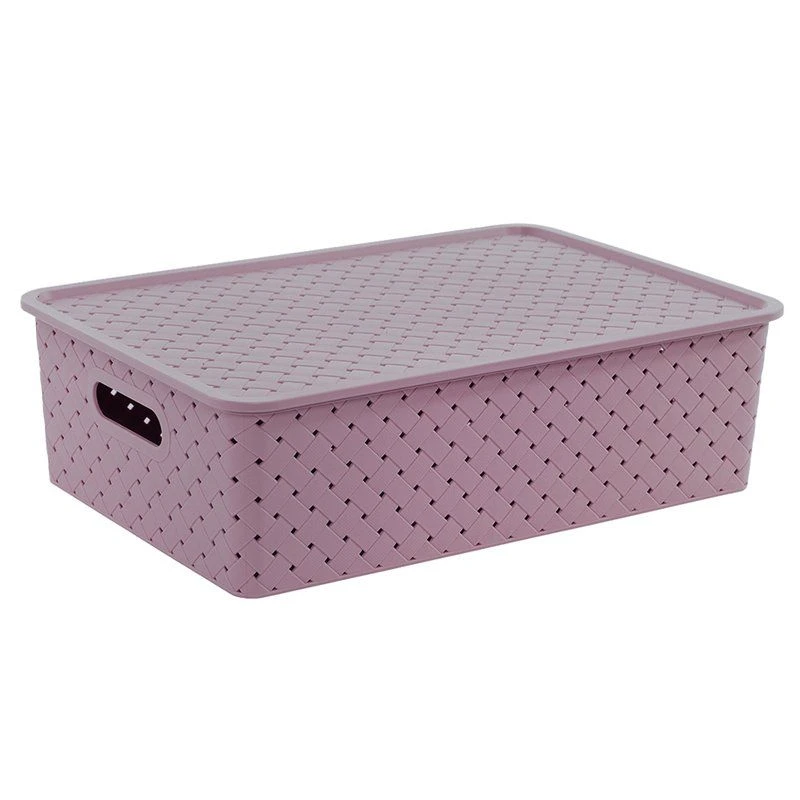 Емкость из пищевого пластика для хранения и переноски мелких аксессуаров и продуктов питания. В объеме 7,5л корзинки оптимальны для хранения товаров для рукоделия, свежих фруктов и ягод, бакалеи и консервов и пр. С врезными ручками обтекаемой формы корзинки удобно перемещать. Бортик по периметру крышек обеспечивает фиксацию при штабелировании корзинок друг на друга. Узор «Береста» по всему корпусу и крышке придает корзинкам натуральный вид и делает их легкими и проветриваемыми.