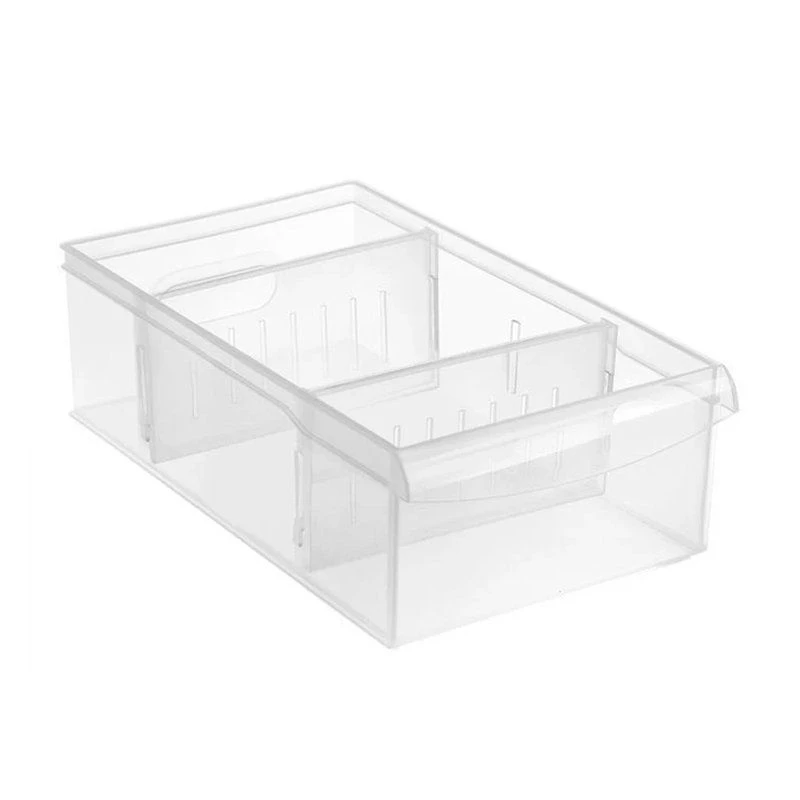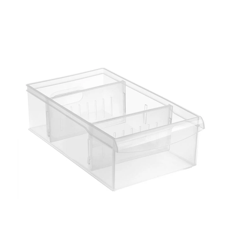 С помощью нескольких перегородок, которые идут в комплекте, и специальных пазов можно менять размер отделений контейнера по необходимости, приспособив как для мелочей, так и для крупных предметов. Прозрачные стенки позволяют видеть, что хранится внутри каждого из контейнеров.