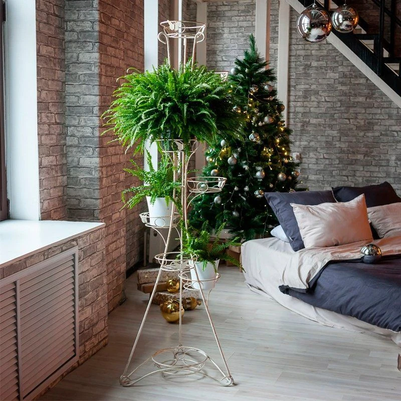 Подставка для цветов предназначена для размещения девяти цветочных кашпо. Изготовлена из массивного рифленого прутка. Цвет: белый с золотым. Корзинки для цветов расположены асимметрично, декорированы колечками и бабочками. Ножки стойки выполнены в виде завитков, между которыми удачно располагается цветочная корзинка. Эта кованая напольная стойка прекрасно впишется в интерьер даже небольшого помещения, и станет его бесспорным украшением.
