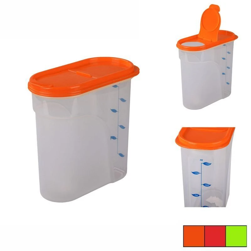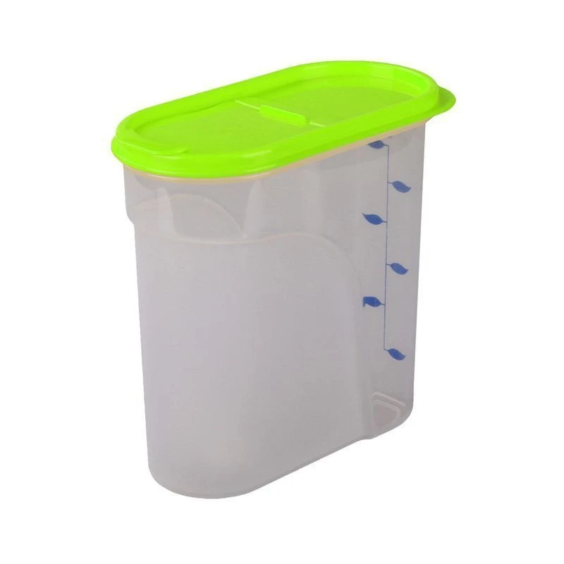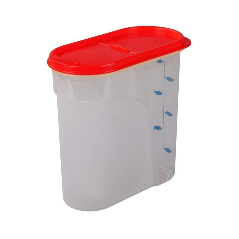 Хранение и использование различных сыпучих продуктов становится очень комфортным благодаря овальной форме ёмкости, углублению на корпусе для удобного захвата и специальной крышке. Прозрачность ёмкости позволяет видеть содержимое, а мерная шкала – его количество. Крышка плотно прилегает к корпусу и защищает содержимое от проникновения влаги и жучков. Откидная часть крышки позволяет дозировано высыпать продукт из ёмкости. Матовое покрытие на углубленной части корпуса препятствует выскальзыванию ёмкости из рук.