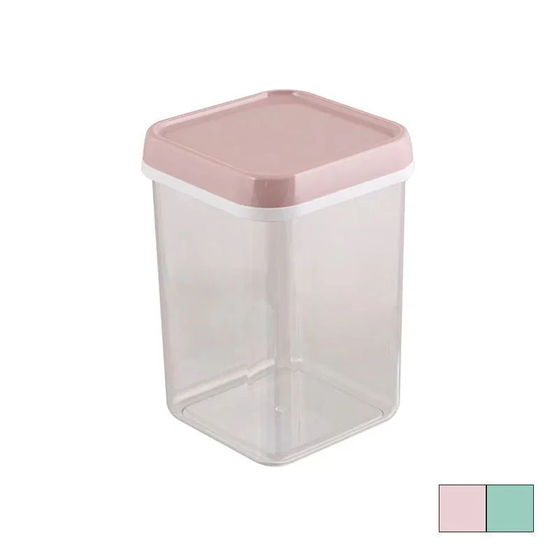 Банка для сыпучих продуктов имеет оригинальную квадратную форму, благодаря чему экономит место на кухонной полке.
