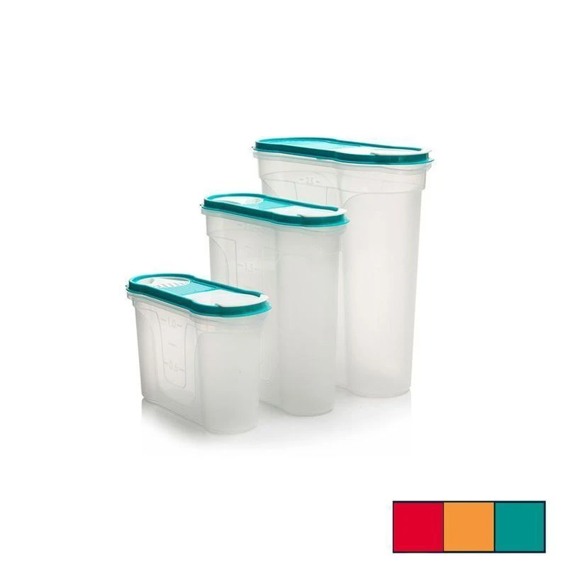Пластмассовая банка для сыпучих продуктов объемом 1,3 л.+2,2 л.+4,0 л для сыпучих продуктов – универсальная тара для хранения соли, муки, круп и любых других сыпучих продуктов на вашей кухне. Использование банки гарантирует аккуратное пересыпание в нужном объеме, экономию места на кухонной полке, оптимальное хранение.