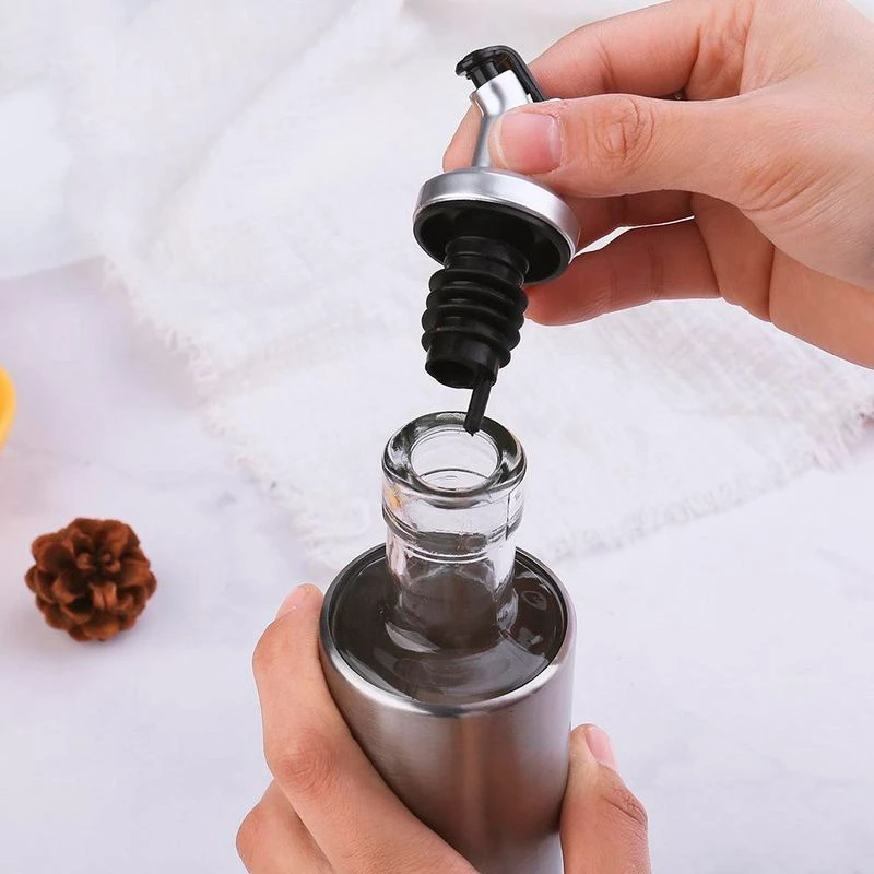 Бутылка стеклянная с носиком-дозатором. Дозатор позволяет наливать ровной, тонкой струйкой. Крышка плотно прилегает и не дает растекаться жидкости, а также не пропускает воздух, не впитывает запахи.