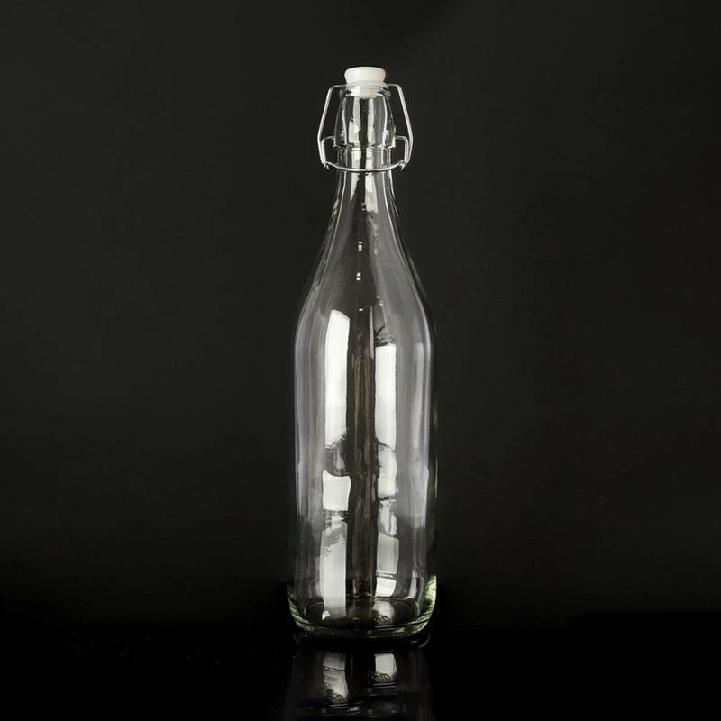 Бутылка из прозрачного стекла гладкая с бугельным замком, многоразового применения. Для воды, спиртных напитков, соусов, уксуса, масла, домашних настоек и много другого.