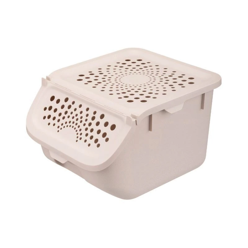 Контейнеры можно ставить друг на друга в устойчивую стопку, оптимизируя полочное пространство на кухне, балконе или в кладовой. Крышка полностью снимается, что позволяет удобно наполнить контейнер. Многочисленные вентиляционные отверстия обеспечат естественную циркуляцию воздуха и отвод избытка влаги. Клапан крышки фиксируется в открытом положении не перекрывая доступ внутрь контейнера расположенного сверху. Производятся из безопасного пищевого полипропилена подлежащего вторичной переработке. Он экологичен и безопасен для человека, не впитывает запахи и легко моется.