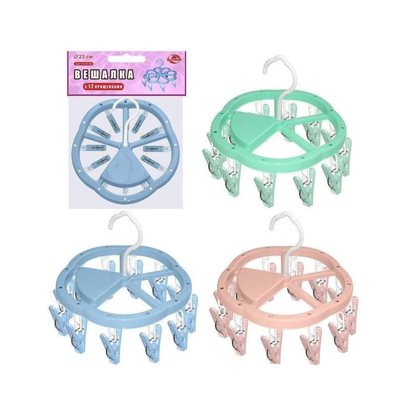 Предназначена для сушки небольших вещей: носков, носовых платочков, белья и т. п. Экономит место, отведенное для сушки белья в ванной комнате или на кухне. Простота, надежность, стойкость к воздействию влаги являются несомненными достоинствами этого изделия. ВНИМАНИЕ! При использовании вешалки с прищепками, старайтесь равномерно распределять вещи во избежание перекоса и поломки! Изготовлена: корпус, крючки и прищепки из пластмассы (полипропилена), пружины из стали, длина прищепок 5,5 см. Диаметр вешалки 23 см.