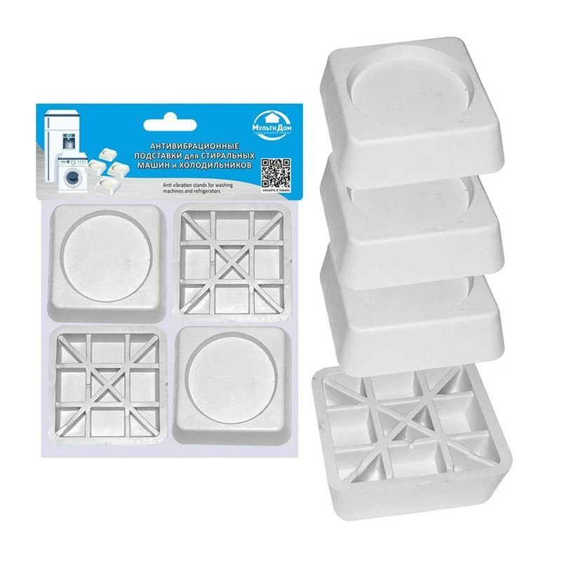 Антивибрационные подставки для стиральной машины и холодильников повышают устойчивость бытовой техники, снижают вибрации. Подставки изготовлены их ПВХ, имеют квадратную форму и нейтральный дизайн.