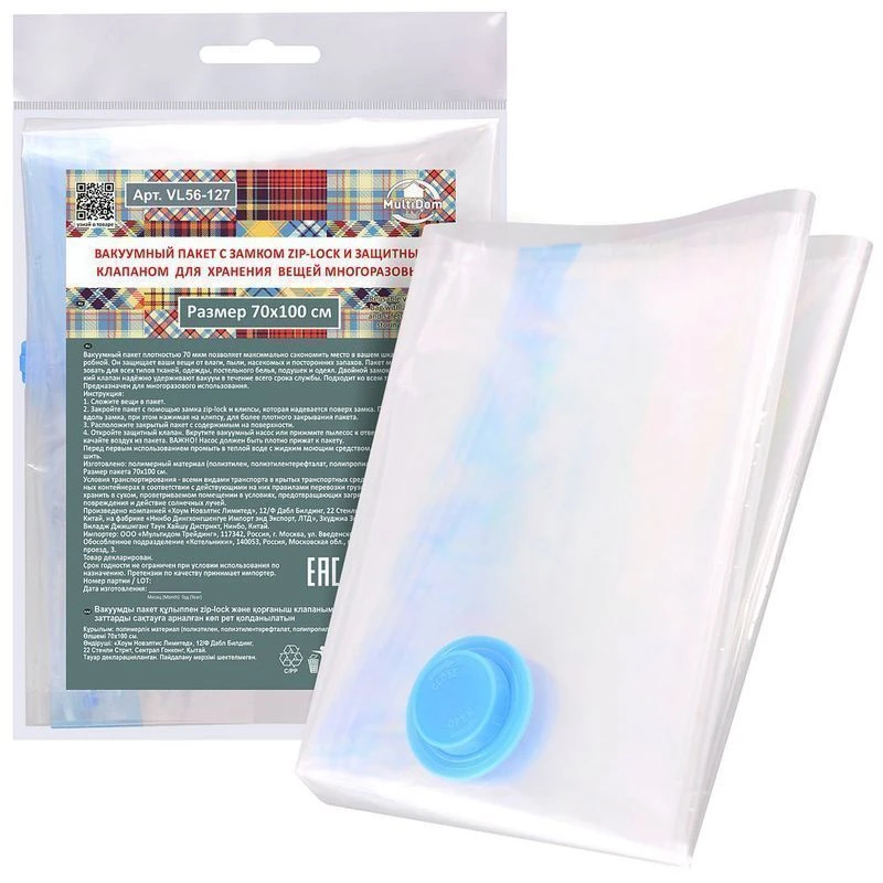 Вакуумный пакет плотностью 40мкм позволяет максимально сэкономить место в вашем шкафу или гардеробной. Он защищает ваши вещи от влаги, пыли, насекомых и посторонних запахов. Пакет можно использовать для всех типов тканей, одежды, постельного белья, подушек и одеял. Двойной замок и автоматический клапан надёжно удерживают вакуум в течение всего срока службы. Подходит ко всем типам пылесосов. Предназначен для многоразового использования.