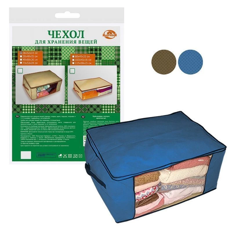 Предназначен для хранения вещей (одежды, пледов, одеял, подушек, покрывал и т. п.) в шкафах, гардеробных, на антресолях. Удобен для упаковки вещей при переездах и путешествиях. Обеспечивает более эффективное использование места, отведенного для хранения вещей, а также защищает их от загязнения. Изготовлен из спанбонда (нетканное термоскрепленное полотно, 100% полипропилен)-воздухопроницаемый материал, обеспечивающий естественную вентиляцию вещей, прозрачная часть из пленки ПВХ (поливинилхлорид). ВНИМАНИЕ! Допускается только ручная стирка при температуре не выше 30 °C.