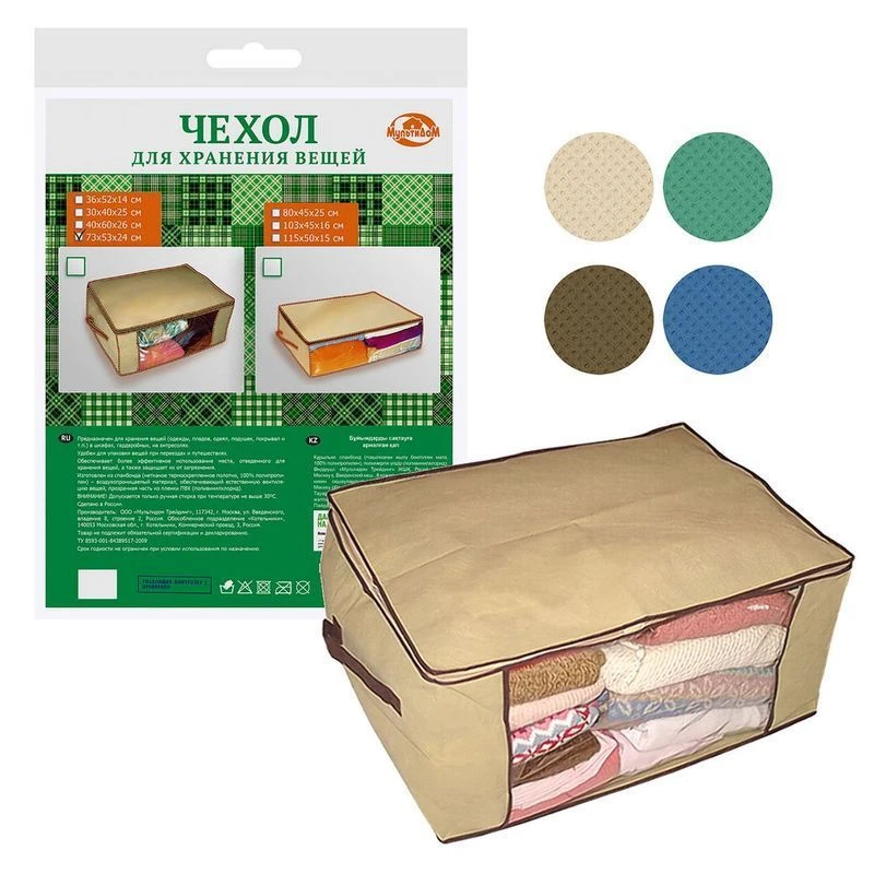 Храните вещи в специальном чехле, чтобы они дольше оставались в порядке. Чехол для хранения вещей подойдет как для одежды, так и для подушек, пледов, одеял. Удобен для хранения в диванах, шкафах, антресолях, имеет прямоугольную форму, что обеспечивает рациональное использование пространства. Защищает вещи от загрязнения, сырости, посторонних запахов. Чехол выручит при переездах и в путешествиях. Изделие изготовлено из спанбонда, материала, обеспечивающего естественную вентиляцию. Прозрачная часть изготовлена из пленки ПВХ (поливинилхлорид). Допускается только ручная стирка при температуре не выше 30° C.