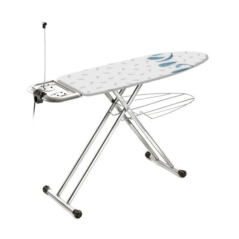 Основа стола - металлический моноблок. Подставка под утюг, полка для белья, розетка с удлинителем 1,5 м, антенна для шнура, антипригарный чехол. Регулировка высоты 70-90 см.
