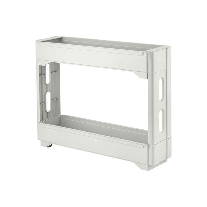 Прямоугольная узкая этажерка - это эффективное и недорогое решение для организации хранения в небольших помещениях, на кухне, в ванной, на балконе или лоджии, в кладовой или на даче. Вместительные полки применяются для хранения большого количества хозяйственных мелочей. Отличительная особенность этажерки - она невысокая и войдет под любую столешницу. Напольная этажерка состоит из двух полок. Габариты этажерки в собранном виде 537х133х450 мм, она собирается без инструментов за несколько минут, достаточно соединить стойки и полки, вставить колеса и заглушки. К нижней полке предусмотрены колесики, этажерку легко выдвигать и устанавливать на место.