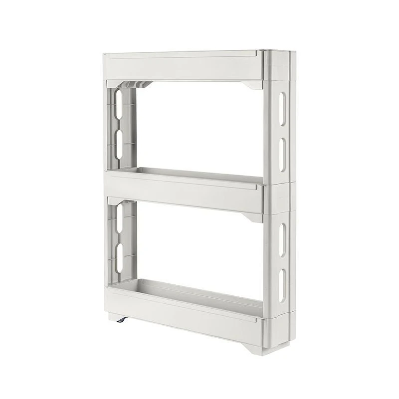 Прямоугольная узкая этажерка - это эффективное и недорогое решение для организации хранения в небольших помещениях, на кухне, в ванной, на балконе или лоджии, в кладовой или на даче. Вместительные полки применяются для хранения большого количества хозяйственных мелочей. Отличительная особенность этажерки - она невысокая и войдет под любую столешницу. Напольная этажерка состоит из трех полок. Габариты этажерки в собранном виде 537х133х710 мм, она собирается без инструментов за несколько минут, достаточно соединить стойки и полки, вставить колеса и заглушки. К нижней полке предусмотрены колесики, этажерку легко выдвигать и устанавливать на место.