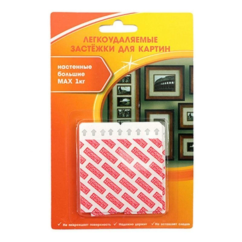 Застежки для картин, состоят из двух частей, надежно держат, легко удаляются не оставляя следов и не портят стены. Одна застежка фиксируется на стене, а другая - на рамке. Вы можете вешать и снимать картины, фотографии так часто, как пожелаете.