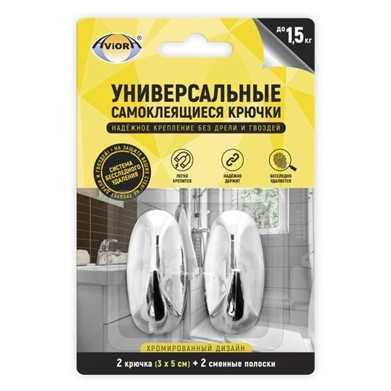 Универсальные хромированные крючки с системой бесследного удаления, отличная альтернатива классическим крючкам, которые нужно прикручивать к стене. Благодаря системе бесследного удаления, крючки легко крепятся и демонтируются после использования. Хромированный дизайн позволит данным крючкам отлично вписаться в интерьер любой ванной комнаты или кухни. В комплекте идут две полоски и два крючка, которые выдерживают до 1,5 кг веса, что позволит разместить на них несколько полотенец для рук. Рекомендуются к приклеиванию на кафель, пластик, гладкую и прочную (не пыльную) основу, крашенную стену, некоторые виды обоев.