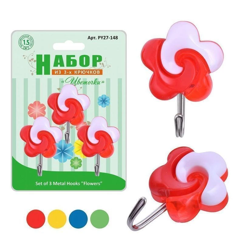 Размещайте свои вещи, используя удобные крючки. Набор из 3-х крючков «Цветочки» выручит вас дома, на даче и в офисе, подходит для кухонного текстиля, навески, легких пакетов и т.п. Изделие крепится на самоклеящуюся основу, которая очень хорошо держится на вертикальной поверхности. В наборе 3 штуки, изготовленные в стильном цветочном дизайне. Основание изготовлено из пластмассы (полипропилен), крючок из хромированной стальной проволоки. Изделие рассчитано на нагрузку до 1,5 кг.