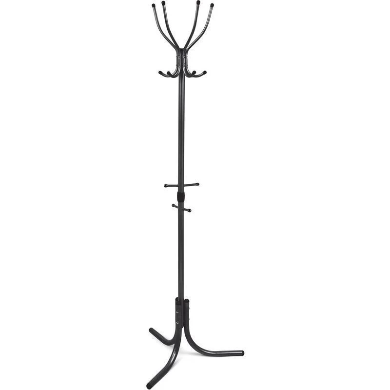 Напольная вешалка из металла предназначена для верхней одежды. Внизу предусмотрены крючки для сумок или зонтов.