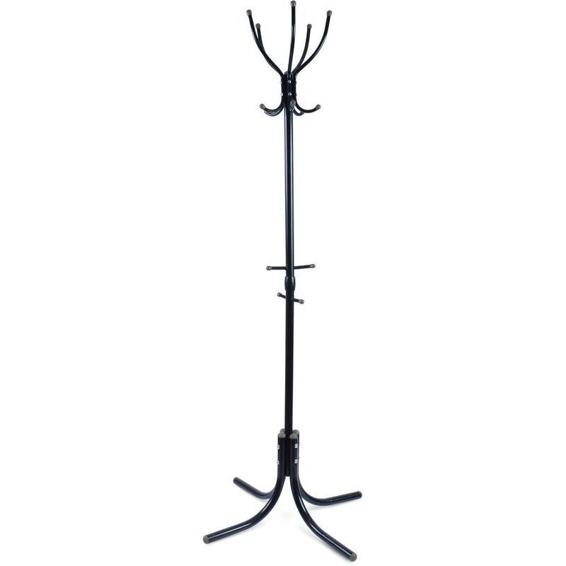 Напольная вешалка из металла предназначена для верхней одежды. Внизу предусмотрены крючки для сумок или зонтов.