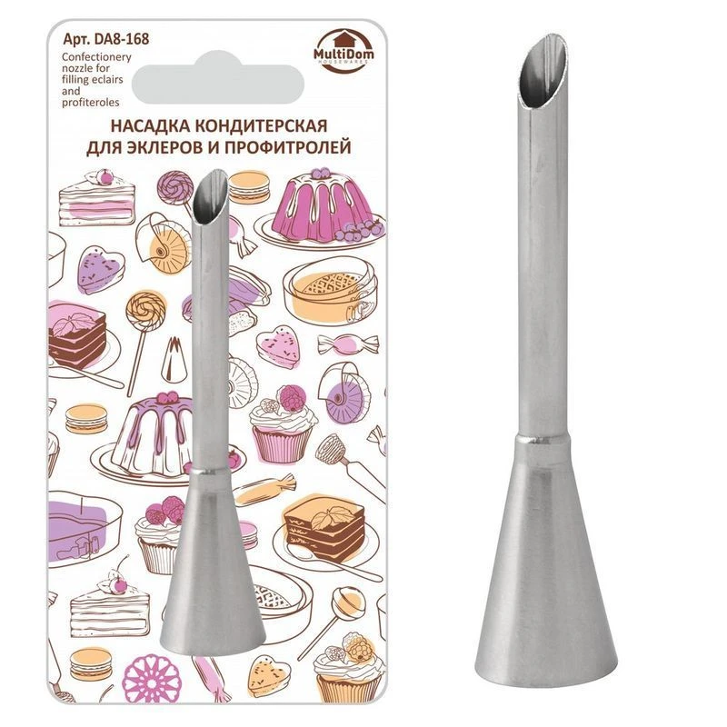 Насадка предназначена для наполнения эклеров, профитролей и другой выпечки начинкой. Очень удобна в использовании. Вы оцените по достоинству это приспособление, потому что Вам больше не придется задумываться о том, как аккуратно наполнить выпечку начинкой, не оставляя при этом следов и разрезов. Благодаря тонкому носику насадки Вы сможете аккуратно проникнуть внутрь выпечки и заполнить ее начинкой. Достаточно лишь: