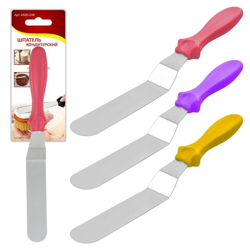 Шпатель применяется для декорирования тортов и выпечки. Это прекрасный инструмент для сглаживания неровностей торта, а также для равномерного нанесения крема, сливок и т.п. на торт. Также пригодится на Вашей кухне при приготовлении и переворачивании готовящихся блюд, например, блинов, оладий или стейка с мясом! Изготовлено: рабочая часть из коррозионностойкой (нержавеющей) стали, ручка из пластмассы (полипропилен).