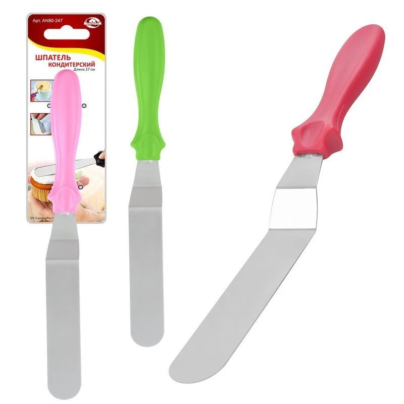 Шпатель применяется для декорирования тортов и выпечки. Это прекрасный инструмент для сглаживания неровностей торта, а также для равномерного нанесения крема, сливок и т.п. на торт. Также пригодится на Вашей кухне при приготовлении и переворачивании готовящихся блюд, например, блинов, оладий или стейка с мясом! Изготовлено: рабочая часть из коррозионностойкой (нержавеющей) стали, ручка из пластмассы (полипропилен).