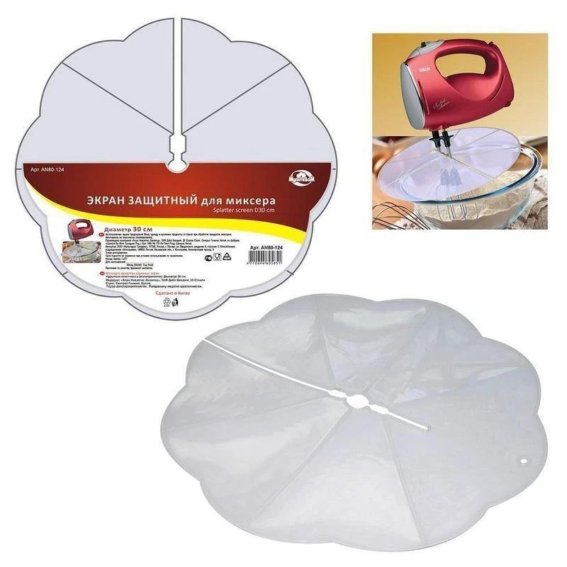 Использование миксера требует аккуратности, ведь во время работы могут лететь брызги во все стороны. Защитный экран для миксера предназначен для поддержания чистоты на кухне, предохранит от попадания продуктов на одежду и другие кухонные предметы. Крышка имеет прорези, куда вставляются насадки и приводятся в рабочее состояние. Чтобы добавить продукты в емкость, не нужно разбирать всю конструкцию, достаточно приподнять вместе с миксером и перевернуть вверх. Изделие изготовлено из полипропилена, легко моется после использования, занимает мало места при хранении с крышками или тарелками.