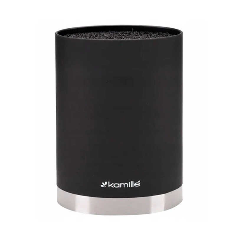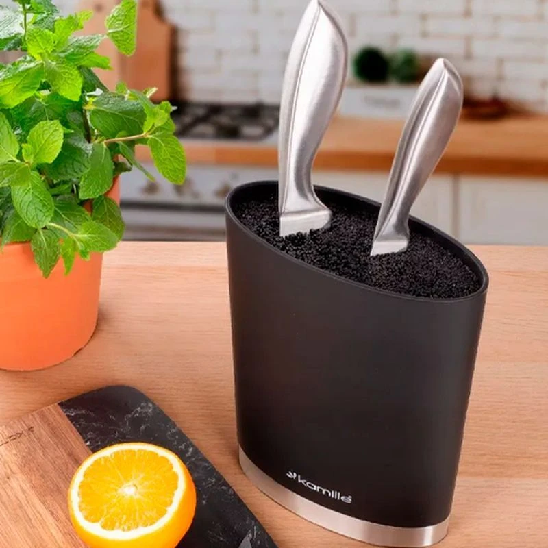 Универсальная блок-подставка для ножей с наполнителем Kamille, позволяет максимально бережно хранить кухонные ножи и ножницы в одном месте, так чтобы они всегда были под рукой. Корпус подставки выполнен из прочного и безопасного пищевого пластика, с приятным на ощупь и глазу покрытием soft-touch. Внутренний блок состоит из тонких и гибких полипропиленовых стержней, которые не вредят лезвиям. При необходимости наполнитель свободно вынимается и моется в посудомоечной машине. Такой держатель подходит как для обычных металлических, так и для керамических ножей и не даст им затупиться, а главное поможет вам держать все ваши любимые инструменты под рукой! Порадуйте себя и своих близких красивым, универсальным и главное - полезным подарком!