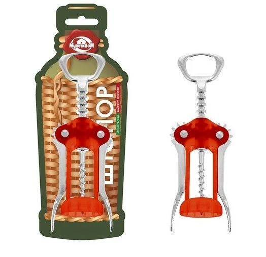 Аккуратно достать пробку из бутылки невозможно без качественного штопора с рычажным механизмом. Изделие позволяет легко открыть любую бутылку, достаточно вкрутить винт и зафиксировать нижнюю часть на горлышке. В процессе вкручивания рычаги будут подниматься вверх, после чего их нужно опустить вниз, чтобы достать пробку. Изделие имеет прочный пластмассовый корпус и рабочую часть из металла с хромированным покрытием.
