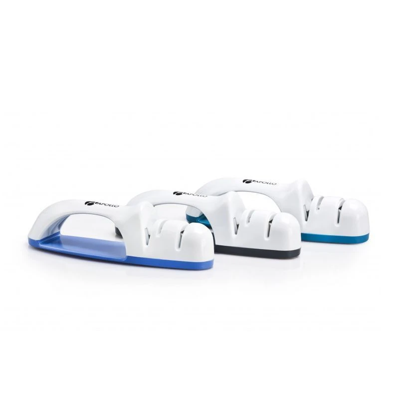 Точилка для кухонных ножей изготовлена из пластика. Точильный элемент изготовлен из абразивного камня.