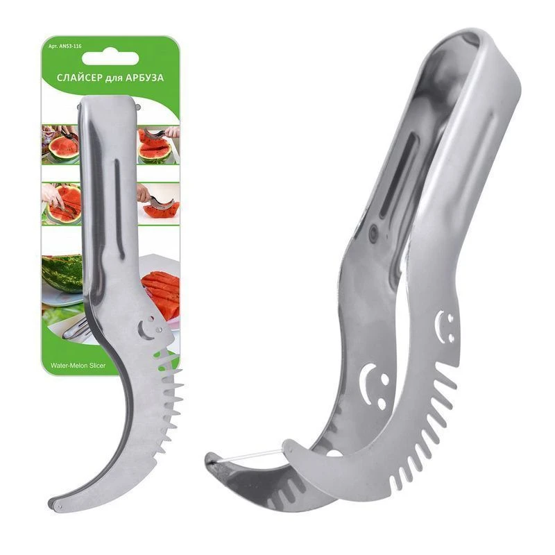 Уникальная конструкция слайсера позволит быстро и аккуратно порезать арбуз на ровные и одинаковые по толщине ломтики. С помощью слайсера вы извлечете только самую вкусную часть арбуза — мякоть. Приспособление служит еще и щипцами, с помощью которых можно захватить порезанные ломтики и перенести их на тарелку. Изделием просто пользоваться, гораздо удобнее, чем нарезать ломтики ножом.