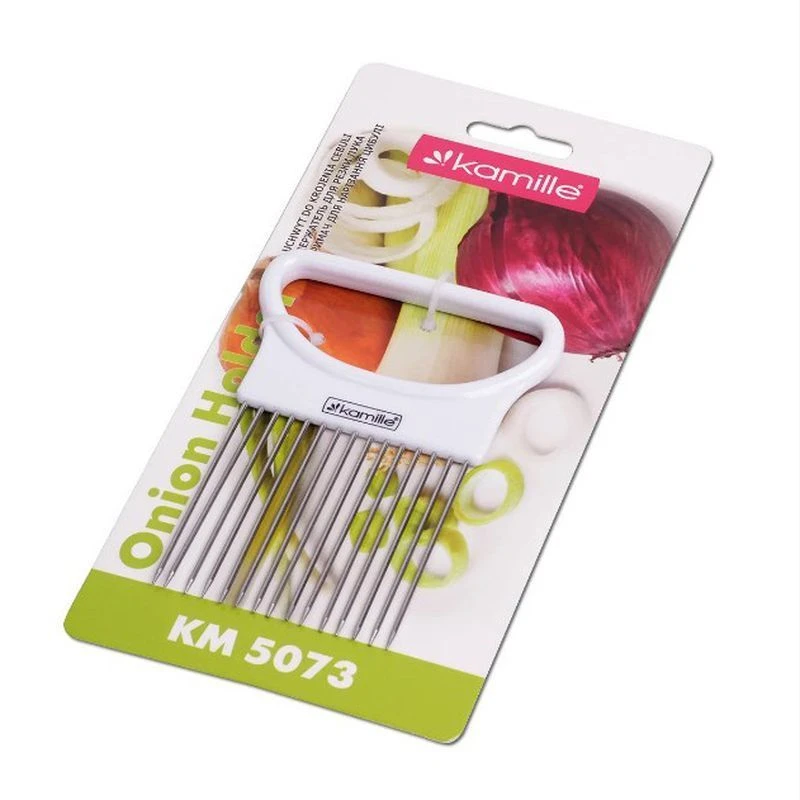 Держатель для нарезки лука - Это идеальное приспособление для легкой и безопасной нарезки. Замечательный помощник на кухне. С этим приспособлением вы нарежете всю луковицу до последнего кусочка и не повредите руки. Очищенный лук наколите на держатель и нарежьте на кусочки.