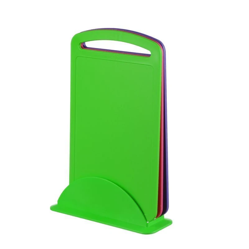 Доски выполнены в различных цветах, что позволяет «закрепить» за каждой группой продуктов определенный оттенок и безошибочно применять его во время приготовления блюд. Удобство использования обеспечивает ручка, с помощью которой пластиковые доски легко брать, переносить, ставить или подвешивать на крючке. Устойчивая подставка с полукруглыми фиксирующими сторонами надежно удерживает их в вертикальном положении. Это создает необходимые условия для сушки изделий, позволяет держать их всегда под рукой и не отнимает рабочее пространство на рабочей поверхности.