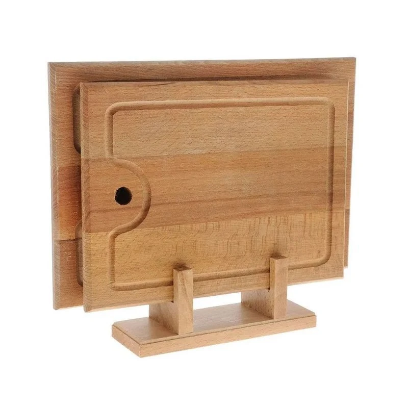 Набр разделочных досок Хозяюшка состоит из 2 разделочных досок и стойки, выполненых из бука. Деревянные разделочные доски отличаются высокой износостойкостью, красивой фактурой дерева и влагостойкостью. Уход за деревянными разделочными досками несложен. Чтобы они не впитывали неприятные запахи, после использования их необходимо помыть в горячей воде, а затем тщательно вытереть. Доски можно хранить как в подвешенном состоянии, так и на оригинальной подставке. Прочный материал позволит эксплуатировать доски долгое время, а классический дизайн придется по вкусу многим хозяйкам.