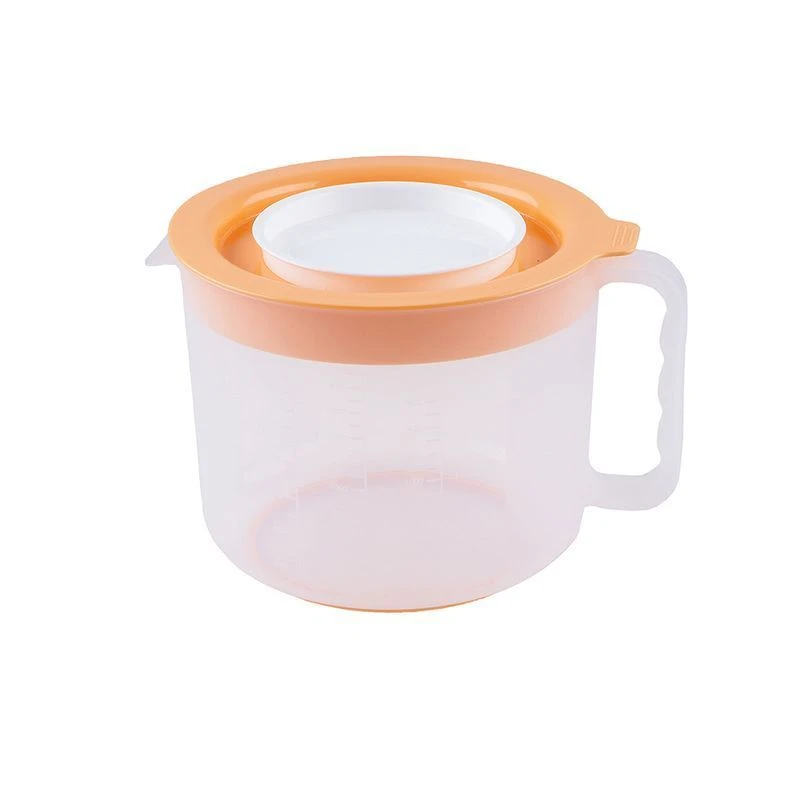 В зависимости от поворота крышки открывается, либо перекрывается носик емкости. Имеется 4 мерных шкал для различных ингредиентов. Сердцевина крышки открывается и позволяет работать в емкости миксером без разбрызгивания взбиваемых компонентов. Дно оснащено мягкой резиновой вставкой - это выполнено для того, чтобы емкость во время использования не скользила.