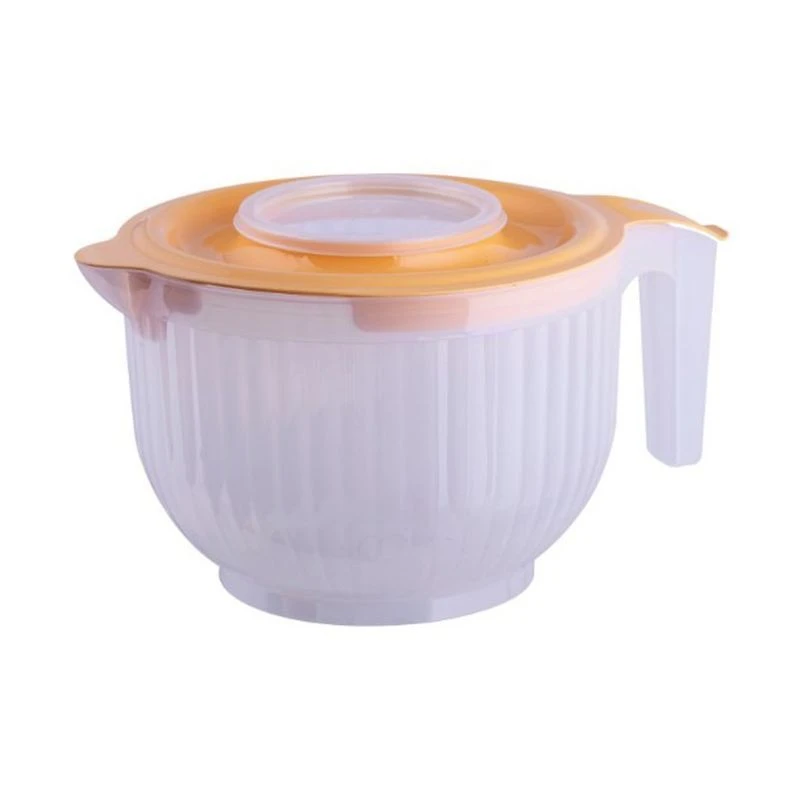 Кружка оснащена двумя крышками. Одна из крышек - с большим отверстием посередине, вторая поменьше. Обе крышки плотно прилегают к краям изделия. Стандартный ручной миксер без труда умещается в отверстие большой крышки, а высокие стенки изделия защищают окружающее пространство от брызг, возникающих при перемешивании продуктов. Большая крышка имеет два «язычка» для быстрого и удобного съема, а также три положения фиксации: