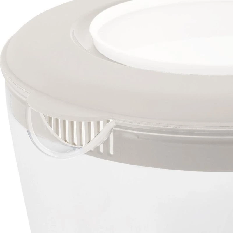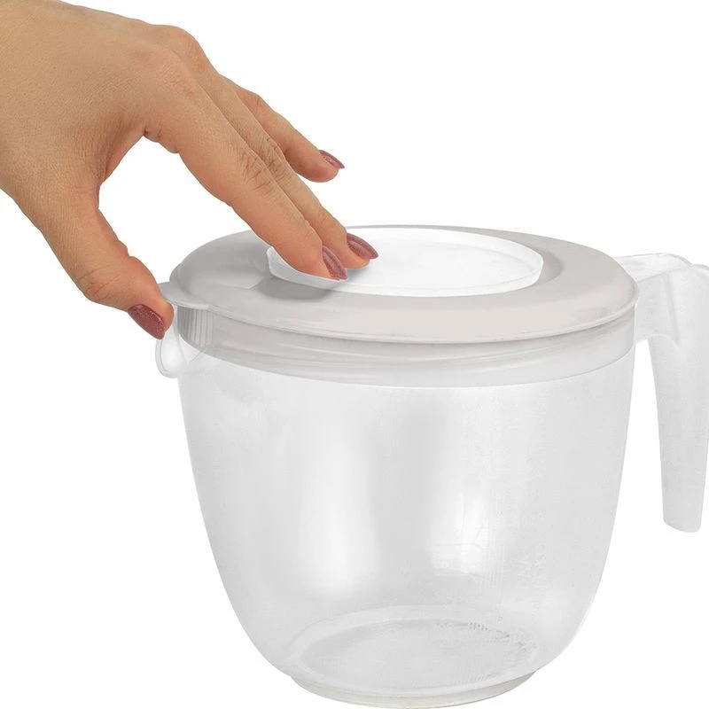 Продуманный дизайн, удобная ручка. Мерные шкалы для разных ингредиентов позволяют отмерить воду, молоко, муку и сахар. Двойная крышка предотвращает разбрызгивание содержимого и защищает рабочие поверхности от загрязнения. Противоскользящая вставка на дне надежно фиксирует ёмкость на столе во время использования.