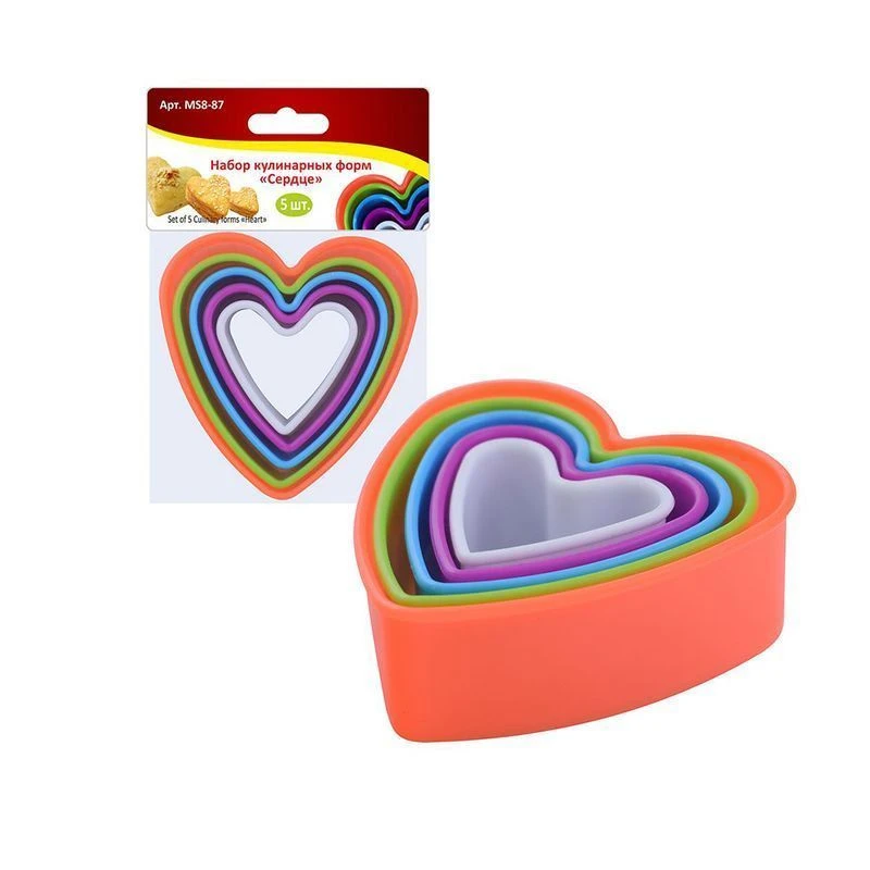 Вырезайте фигурки из теста, создавайте многоярусные десерты, оформляйте салаты с набором кулинарных форм «Сердце». В наборе 5 формочек в виде сердечек, высотой 3,5 см, с размерами 5х5; 6х6,3; 7х7,5; 8х8,5; 9х9,5 cм. Приспособления имеют несколько способов применения, с их помощью можно: